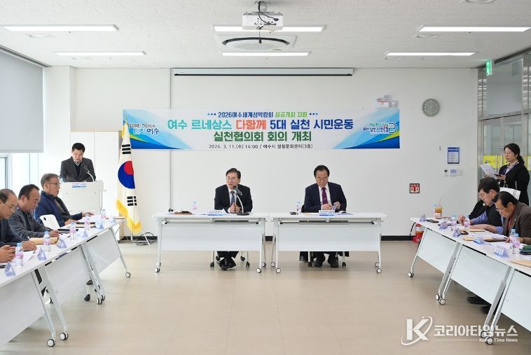 코리아타임뉴스 전남취재본부 | 여수시는 지난 11일 생활문화센터에서 ‘여수 르네상스 다함께 5대 실천 시민운동’ 실천협의회 2026년 첫 정기회의를 개최하고 2026여수세계섬박람회 성공개최를 위한 시민 참여 확대 방안을 논의했다고 밝혔다.