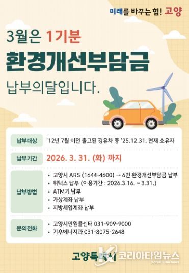 코리아타임뉴스 기동취재팀 | 고양특례시는 노후 경유 차량 소유자를 대상으로 2026년 상반기 정기분 환경개선부담금을 부과한다고 12일 밝혔다.