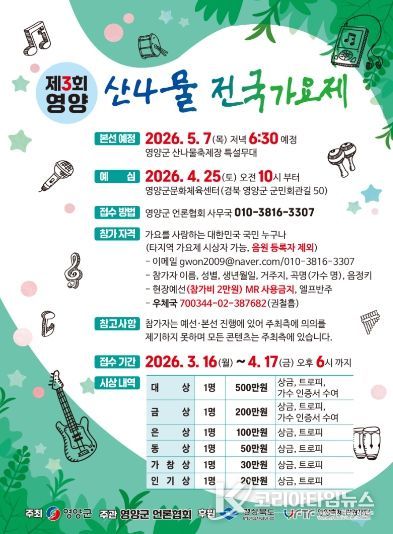 코리아타임뉴스 경북취재본부 | 오는 5월 ‘제21회 영양산나물축제’의 시작을 알리는 ‘제3회 영양 산나물전국가요제’를 개최하고, 무대를 빛낼 주인공들을 모집한다.