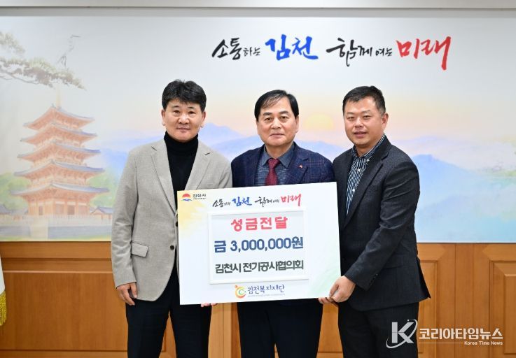 시 관계자는 “지역사회 복지를 위해 따뜻한 나눔을 실천해 주신 김천시 전기공사협의회에 감사드린다. 기탁해 주신 성금은 도움이 필요한 이웃을 위해 소중히 사용하겠다.”라고 말했다.