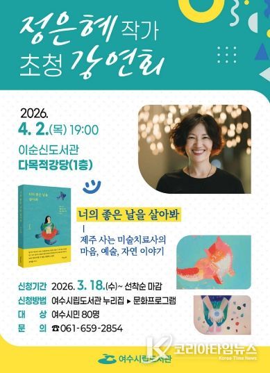 코리아타임뉴스 전남취재본부 | 여수시는 오는 4월 2일 오후 7시 이순신도서관 다목적강당에서 정은혜 작가를 초청해 강연회를 개최한다고 밝혔다.
