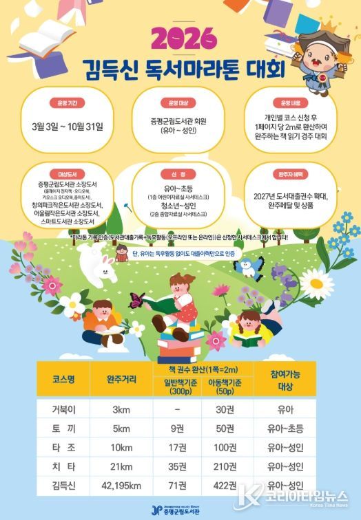 코리아타임뉴스 박찬식 기자 | 충북 증평군립도서관이 책 읽는 문화 확산을 위해 ‘김득신 독서마라톤’ 대회를 이달부터 10월까지 운영한다고 19일 밝혔다.