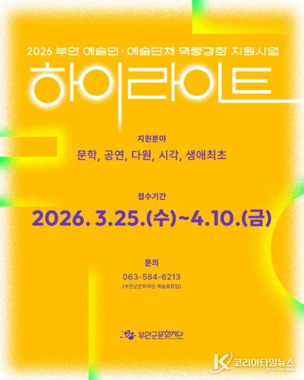 코리아타임뉴스 전북취재본부 | (재)부안군문화재단은 지역 예술인의 창작 활동을 지원하고 지속 가능한 예술 생태계를 조성하기 위해 2026 부안 예술인 역량강화 사업 '하이라이트' 참여 예술인과 예술단체를 모집한다.