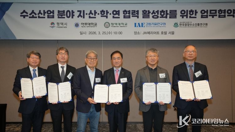 코리아타임뉴스 경제팀 | 평택시는 25일, 아주대학교·평택대학교·고등기술연구원·한국청정수소진흥연구원과 '수소산업 분야 지산학연 협력 활성화를 위한 업무협약(MOU)'을 체결했다고 밝혔다.