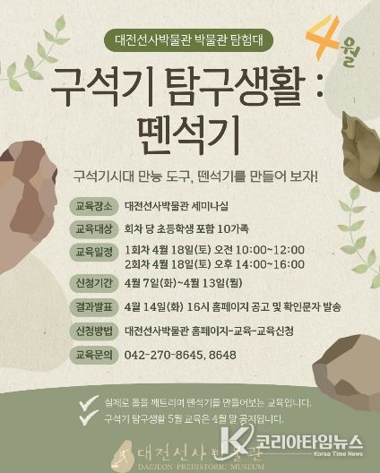 코리아타임뉴스 대전취재본부 | 대전선사박물관은 4월 18일 오전과 오후 두 차례에 걸쳐 가족 대상 교육 프로그램 ‘구석기 탐구생활’을 운영한다.