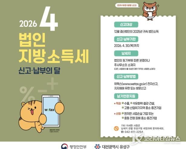 코리아타임뉴스 대전취재본부 | 대전 유성구는 오는 30일까지 2025년 귀속 법인지방소득세 신고납부 기간을 운영한다.