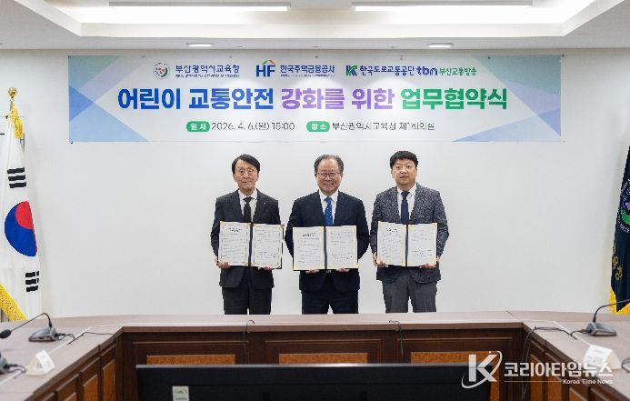 코리아타임뉴스 사회팀 | 부산광역시교육청은 지난 6일 오후 시교육청 회의실에서 어린이 교통사고 예방과 안전한 통학환경 조성을 위해 한국주택금융공사, 한국도로교통공단 tbn부산교통방송과 ‘어린이 교통안전 강화를 위한 업무 협약’을 체결했다.