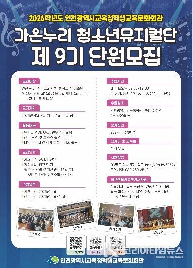 코리아타임뉴스 사회팀 | 인천광역시교육청학생교육문화회관은 4월 7일부터 24일까지 인천 지역 청소년을 대상으로 ‘2026년 청소년뮤지컬단 제9기’ 신규 단원을 모집한다.