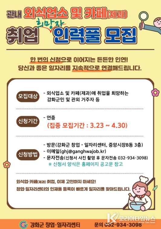 코리아타임뉴스 기동취재팀 | 강화군 창업·일자리센터가 '관내 외식 업소 및 카페(제과) 취업 희망자 인력풀' 운영을 본격적으로 시작한다고 밝혔다.