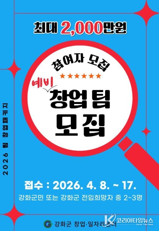 코리아타임뉴스 기동취재팀 | 강화군 창업·일자리센터가 '2026년도 팀 창업패키지 지원사업' 참여자를 모집한다.