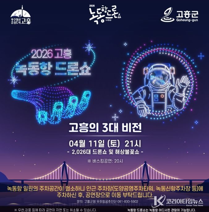 한편, 2026 고흥 녹동항 드론쇼는 4월 11일 첫 공연을 시작으로 오는 10월까지 매주 토요일 저녁, 녹동항 일원에서 900대의 드론을 활용한 상설공연이 진행된다.