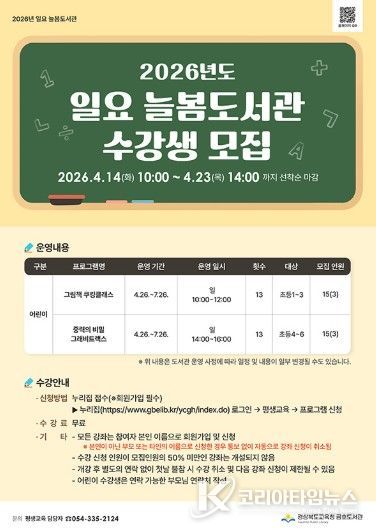 코리아타임뉴스 사회팀 | 경상북도교육청 금호도서관은 초등학생들에게 학교의 정규수업 외 추가적인 교육활동의 기회를 부여하기 위하여‘2026년 일요 늘봄도서관’프로그램을 개설하여 수강생을 모집한다.