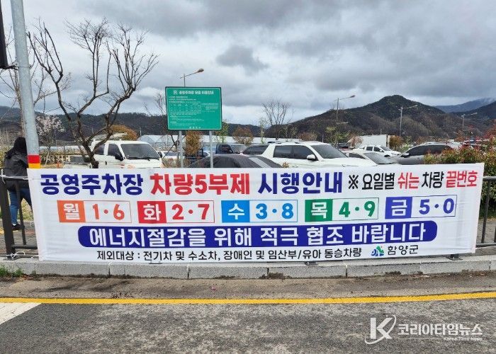코리아타임뉴스 오영주 기자 | 함양군은 정부의 에너지 절약 방침에 따라 대중교통 이용을 유도하기 위해 4월 8일부터 공영주차장 승용차 5부제를 시행한다고 밝혔다.