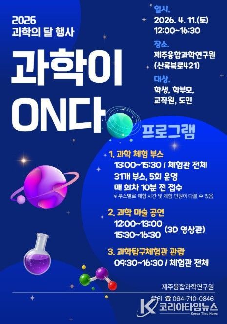 코리아타임뉴스 사회팀 | 제주도교육청 제주융합과학연구원은 과학의 달을 맞아 11일 연구원 일원에서 도민과 함께하는 2026년 과학의 달 행사 ‘과학이 온(ON)다’를 개최한다.