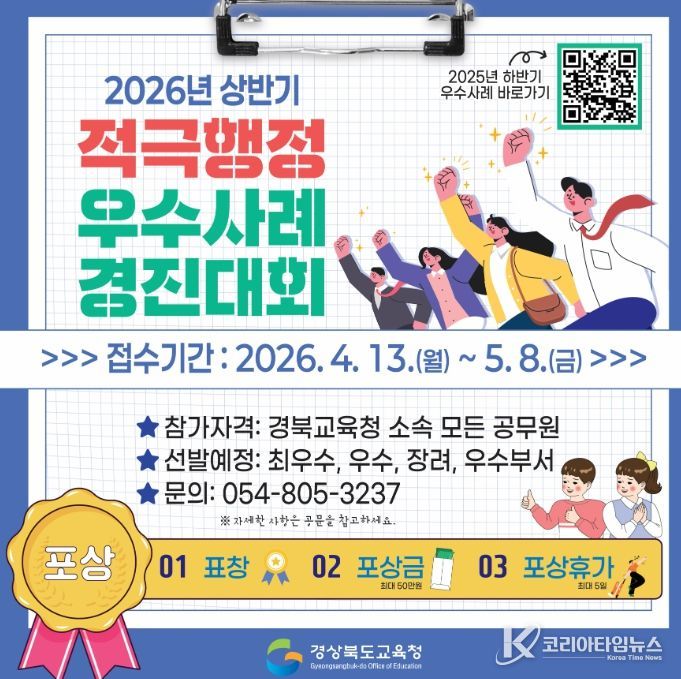 코리아타임뉴스 사회팀 | 경북교육청은 능동적이고 창의적인 공직문화를 조성하고 교육 현장의 변화를 이끈 우수 사례를 발굴하기 위해 ‘2026년 상반기 적극행정 우수 사례 경진대회’를 개최한다고 15일 밝혔다.