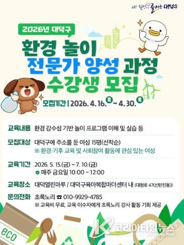 코리아타임뉴스 대전취재본부 | 대덕구는 지역 내 환경교육 활성화와 여성 일자리 창출을 위해 ‘환경 놀이 전문가 양성과정’을 운영하고 참여자를 모집한다.
