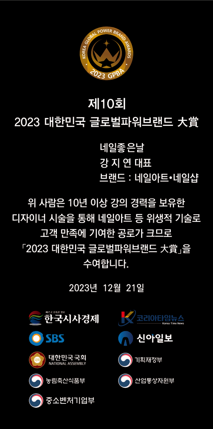 코리아타임뉴스 김택호 기자 | 글로벌파워브랜드 대상과 국회 보건복지위원장 표창을 수상한 네일좋은날(대표 강지연)은 네일아트뿐 아니라 문제성 발톱, 발, 속눈썹 등 위생적 관리를 제공하는 인천 남동구 서창동 소재의 네일아트샵이다.