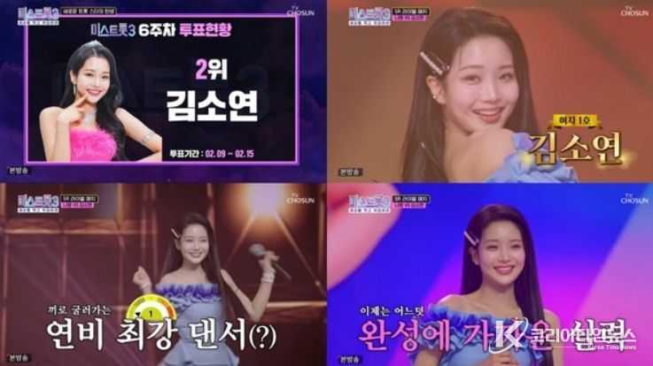 이날 김소연은 6주 차 투표 현황에서 2위로 순위가 상승하며 날로 높아지는 인기를 입증했다. 이어진 라이벌 매치에서 '미스트롯3' TOP14 나영, '미스터트롯2' TOP7 박지현과 팀을 이룬 김소연은 1차 무대에서 우연이의 '그남자' 무대를 선보였다.