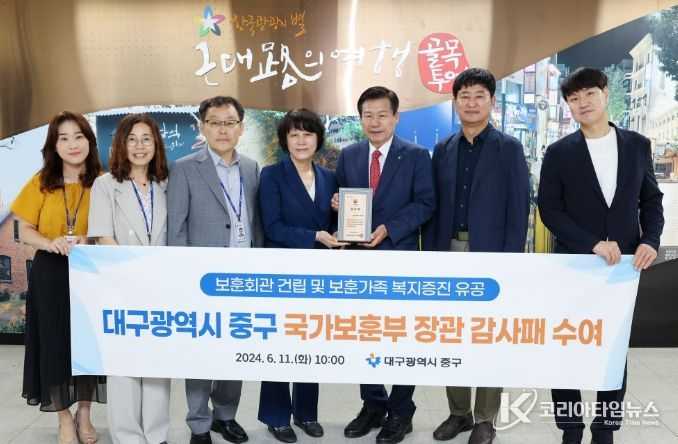 코리아타임뉴스 대구취재본부 | 대구 중구는 보훈회관 건립 및 보훈가족 복지증진에 대한 기여와 공로를 인정받아 11일 국가보훈부 장관 감사패를 받았다.