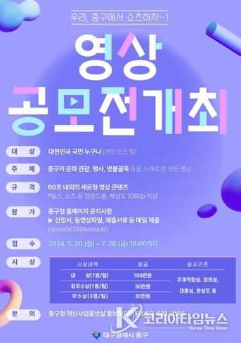코리아타임뉴스 대구취재본부 | 대구 중구는 내달 26일까지 중구의 다양한 매력을 60초의 영상으로 알리기 위한 쇼츠 영상 공모전을 연다.