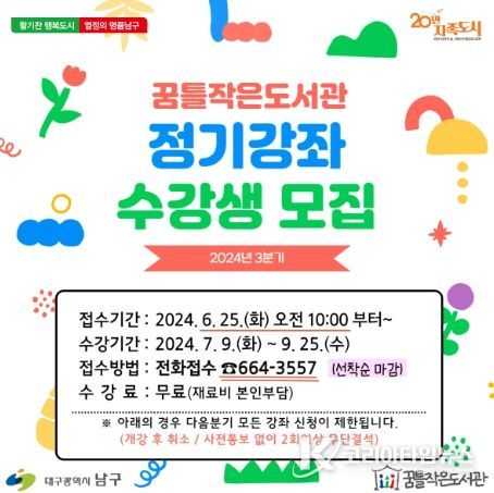 코리아타임뉴스 대구취재본부 | 대구 남구는 공립 꿈틀작은도서관에서 7월 9일부터 9월 25일까지 3분기 정기문화강좌를 운영한다고 밝혔다.