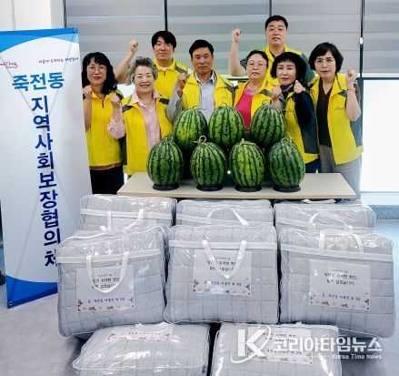 죽전동은 6월 호국보훈의 달을 맞아 지난 18일 관내 거주하는 저소득 국가유공자 및 유족 11세대에게 여름 냉방용품을(이불세트, 수박) 전달하고 안부를 확인 및 위로하는 등『호국열정은 뜨겁게, 여름은 시원하(夏)게』사업을 실시했다.