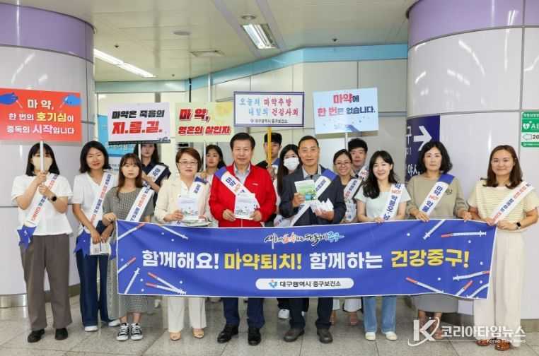 코리아타임뉴스 대구취재본부 | 대구 중구는 26일 제38회 세계 마약퇴치의 날을 맞이해 2호선 청라언덕역에서 아침 출근 및 등교시간 청라언덕역을 이용하는 성인 및 청소년을 대상으로 마약류 중독예방 캠페인을 실시했다.
