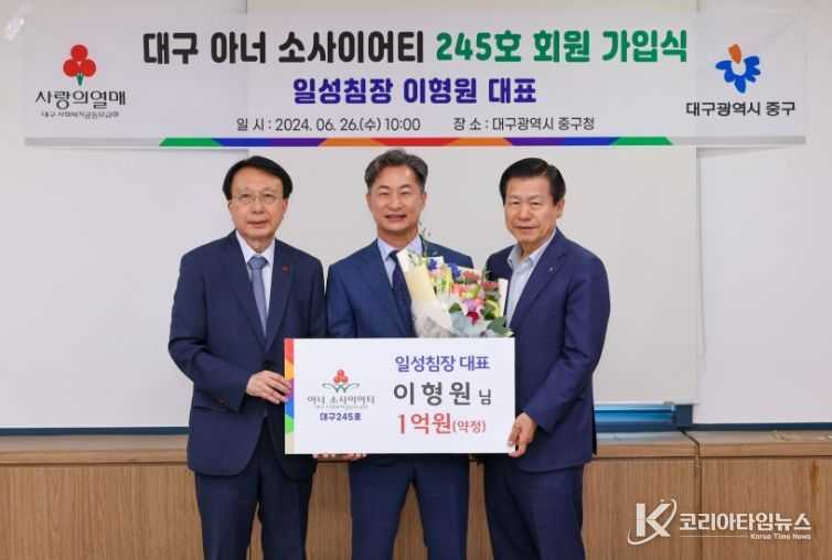 코리아타임뉴스 대구취재본부 | 대구 중구에서 1억 원 이상 기부를 약속한 고액기부자 모임인 '대구 아너 소사이어티' 245번째 회원이 탄생했다.