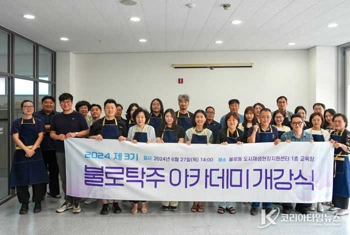 코리아타임뉴스 대구취재본부 | 대구 동구청은 지난 6월 27일 불로동 도시재생뉴딜사업 창업·기술전수교육의 일환으로 추진하는 ‘2024 제3기 불로탁주아카데미(기초과정)’ 개강식을 가졌다.
