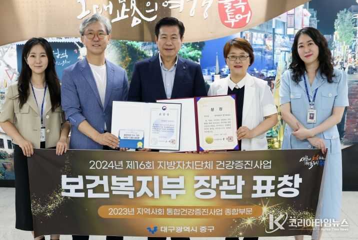 코리아타임뉴스 대구취재본부 | 대구 중구는 보건복지부 주관 ‘제16회 지방자치단체 건강증진사업 성과대회’에서 지역사회 통합건강증진사업 종합부문 우수 지자체로 선정돼 보건복지부장관 표창을 수상했다.