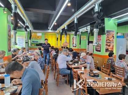 코리아타임뉴스 대구취재본부 | 대구 북구 태전1동 맛있는 이오갈비 태전직영점은 초복을 맞아 7월 10일 관내 경로당 3개소(은마, 두성3차, 한라) 어르신 50명에게 삼계탕 나눔 활동을 펼쳤다.