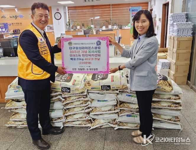 코리아타임뉴스 대구취재본부 | 대구 월성라이온스클럽 김필훈 회장(중구 새마을협의회 이사)은 15일 대봉1동 행정복지센터(동장 정경미)를 방문해 백미 20kg 40포(220만원 상당)를 이웃돕기 성품으로 기탁했다.