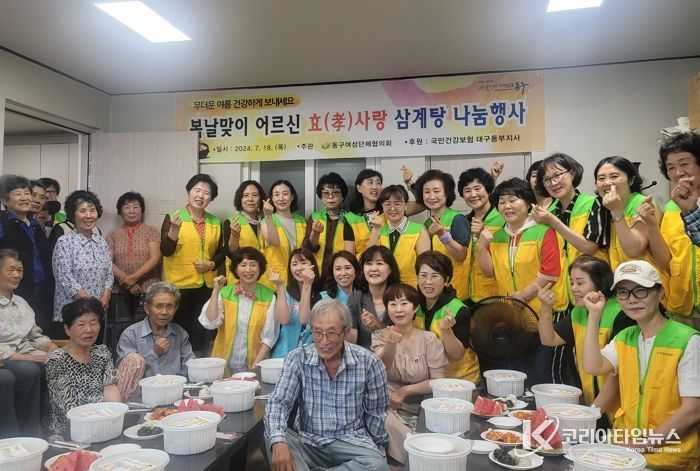 코리아타임뉴스 대구취재본부 | 대구 동구여성단체협의회는 지난 18일, 부동경로당에서 복날 맞이 효(孝)사랑 삼계탕 나눔 행사를 가졌다.
