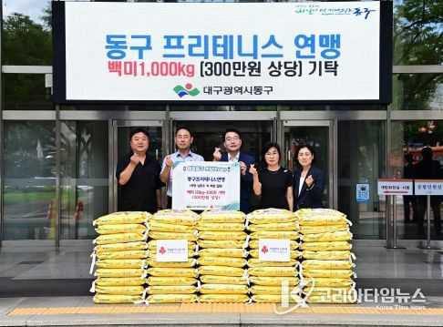 코리아타임뉴스 대구취재본부 | 동구 프리테니스 연맹은 지난 22일 구청을 방문, 어려운 이웃을 위해 사용해 달라며 백미 10kg 100포(300만원 상당)를 기탁했다. 기탁받은 물품은 동구 지역 내 저소득가정에 전달될 예정이다.