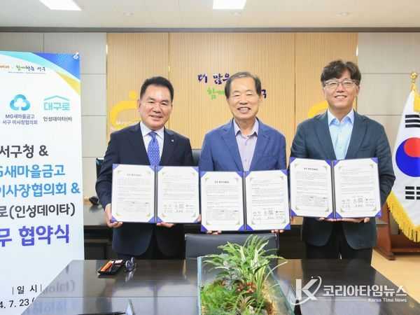 코리아타임뉴스 대구취재본부 | 대구 서구청은 23일 ‘MG새마을금고 서구 이사장협의회’, 대구로앱 운영사‘인성데이타(주)’와 대구로 서구day 업무협약식을 가졌다.