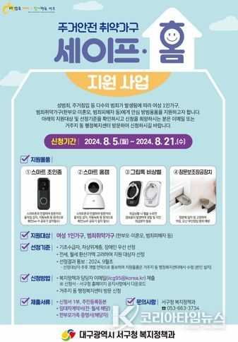 코리아타임뉴스 대구취재본부 | 대구광역시 서구는 관내 여성 1인가구, 범죄취약가구 등을 대상으로 '주거안전 취약가구 세이프-홈'지원 사업을 추진한다고 밝혔다.