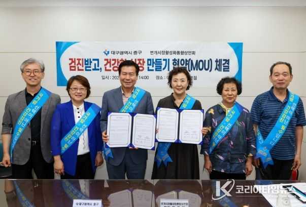 코리아타임뉴스 대구취재본부 | 대구 중구는 8일 번개시장(태평로 177-1)에서 번개시장 활성화통합상인회(회장 화은경)와 검진받고 건강한 시장 만들기 업무협약(MOU)을 체결했다.