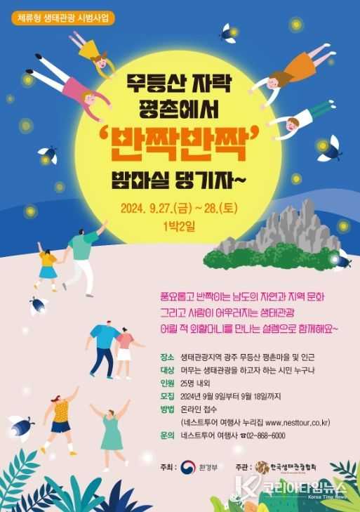 코리아타임뉴스 이아름 기자 | 환경부는 천혜의 생태관광지를 1박 2일 일정으로 머물며 체험해 볼 수 있는 ‘2024년 체류형 생태관광 체험단(25명)’을 9월 9일부터 18일까지 모집한다.