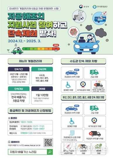 이와 함께, 서울, 인천, 경기 등 주요 특·광역시에서는 5등급 차량의 평일 운행 제한이 시행되며, 위반 시 1일 10만 원의 과태료가 부과된다. 단, 배출가스 저감장치를 부착한 차량이나 장애인 차량 등은 단속에서 제외된다. 배출가스 저감장치 부착 등 저공해 조치를 원하는 차량 소유주는 시군에 신청하면 비용 지원을 받을 수 있다.