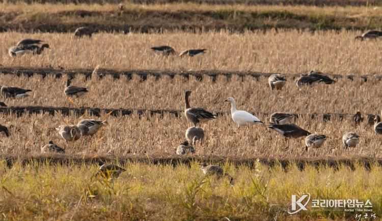 코리아타임뉴스 권충현 기자 | 순천시는 지난 1일 아침 8시 30분에 순천만 흑두루미 희망농업단지에서 흰기러기 1마리가 첫 관찰됐다고 밝혔다.