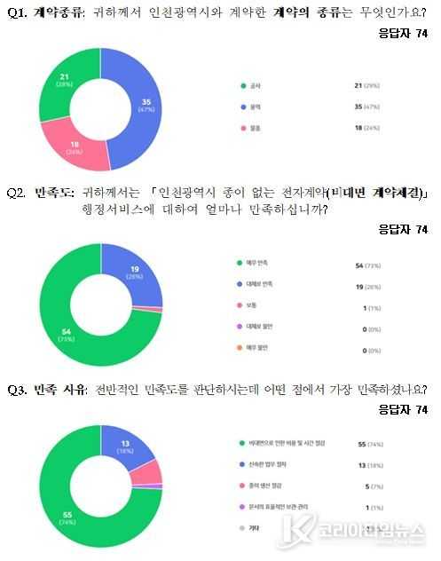 이번 조사는 올해 인천시와 전자계약 방식으로 계약을 체결한 74개 업체를 대상으로 지난달 15일부터 3일간 온라인으로 실시됐으며, 제도에 대한 전반적인 만족도와 만족·불만족 사유 등을 포함한 5개 문항으로 진행됐다.