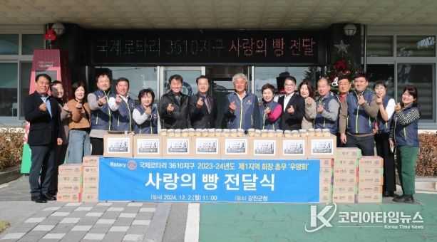 코리아타임뉴스 권충현 기자 | 국제로타리 3610지구 전임 총재와 여수, 강진 전임 임원단이 지난 2일 강진군청에서 어르신들을 위한 사랑의 빵 나눔 전달식을 가졌다.