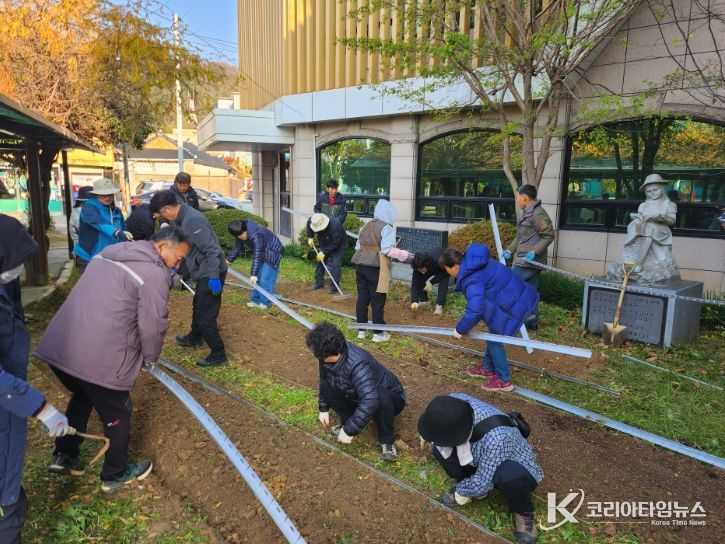 마지막 수업에서는 순천대 미래융합대학 박석곤 학장, 정원학과 김선화 교수 지도아래 수강생 30명(학생장 윤애현)이 참여해 도서관 소녀상 앞에 한 평 정원을 만드는 실습이 진행됐다.