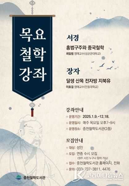 시 관계자는 “목요철학강좌는 원주 시민 누구나 참여할 수 있는 열린 강좌”라며, “동양의 고전을 통해 우리 삶의 가치를 찾는 기회가 되길 바란다.”라고 전했다.