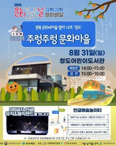 코리아타임뉴스 경북취재본부 | 2025 문화가 있는 날 '구석구석 문화배달' 경북 온(On)마을 열차 12호 - 청도군 ‘주렁주렁 문화마을’이 오는 8월 31일 오후 2시, 청도어린이도서관에서 열린다.