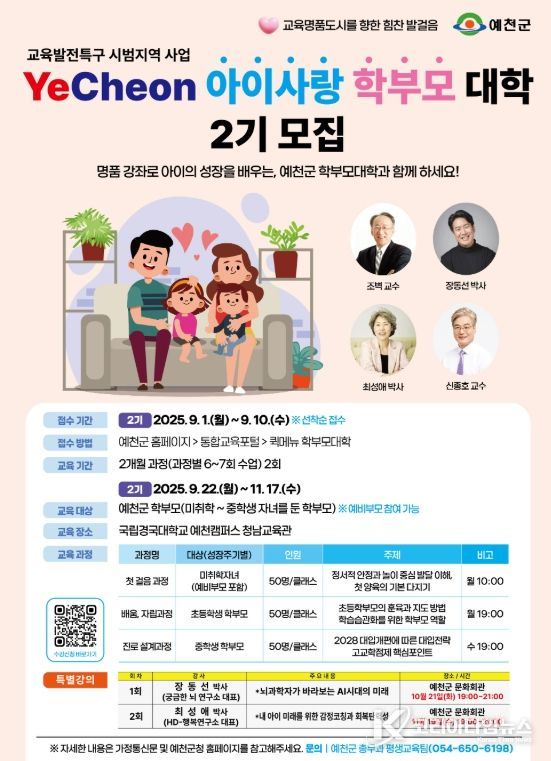 코리아타임뉴스 경북취재본부 | 예천군은 지역 학부모들의 자녀 이해와 양육 역량 강화를 위해 운영되는 ‘예천 아이사랑 학부모 대학’ 2기 수강생을 9월 1일부터 10일까지 모집한다.