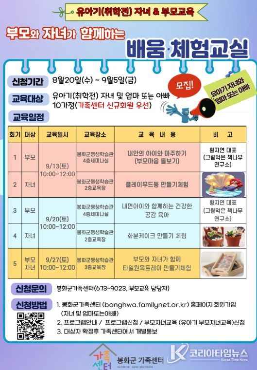 코리아타임뉴스 경북취재본부 | 봉화군가족센터가 오는 9월 5일까지 ‘‘2025년 생애주기별 부모와 자녀 역량강화교육’에 참여할 대상자를 모집한다.