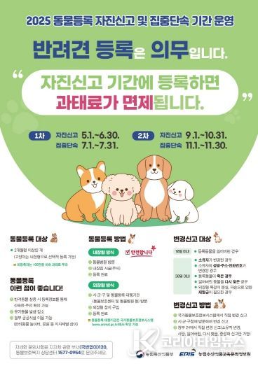 코리아타임뉴스 경북취재본부 | 포항시는 반려견 동물 등록을 활성화하고 관련 기존 등록정보를 현행화하기 위해 9월 1일부터 10월 31일까지 ‘동물등록 자진신고 기간’을 운영한다.