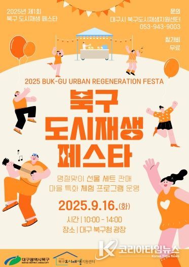 코리아타임뉴스 대구취재본부 | 지역 주민과 마을협동조합이 함께한 『2025 북구 도시재생 페스타』가 오는 9월 16일 오전 10시부터 오후 2시까지 북구청 앞마당에서 열린다.