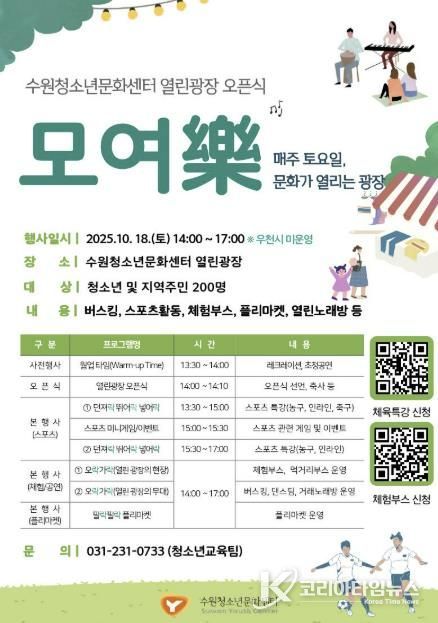 코리아타임뉴스 이아름 기자 | 수원시청소년청년재단 청소년문화센터는 오는 10월 18일 청소년문화센터 야외광장에서'열린광장 오픈식‘모여락(樂')을 개최한다.